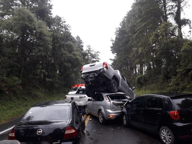 O acidente aconteceu no local conhecido como Serra da Santa, por volta das 8h30. Com o impacto da colisão, uma caminhonete Hilux foi parar em cima de um Focus. De acordo com o soldado Marcos Cavichiolli, do Corpo de Bombeiros Militar de Otacílio Costa, uma idosa e uma adolescente de 17 anos, que estavam em um Fox, tiveram ferimentos leves. Elas foram encaminhadas ao Hospital Santa Clara, em Otacílio Costa, por socorristas Serviço de Atendimento Móvel de Urgência (Samu). Os outros ocupantes dos veículos não se feriram, segundo o bombeiro.