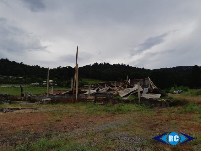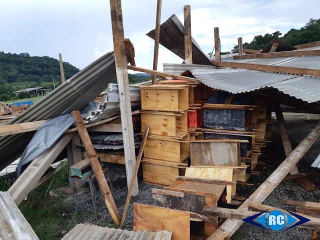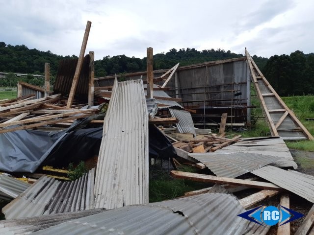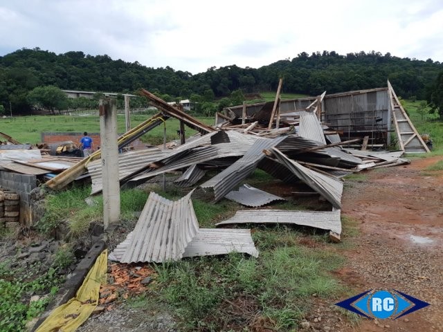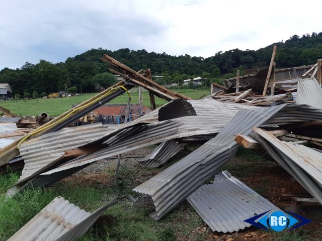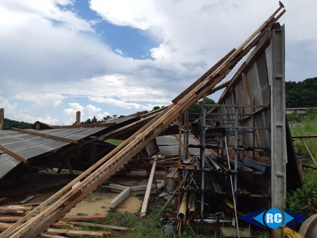 A cobertura de um barracão de aproximadamente 400 metros quadrados foi completamente destruída. O telhado de alumínio foi arrancado, sendo que algumas chapas pararam em cima de árvores. As vigas de madeira acabaram desabando.