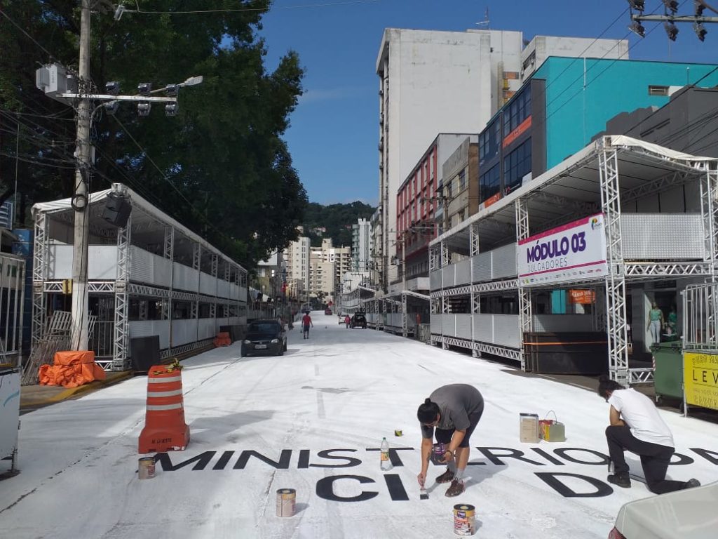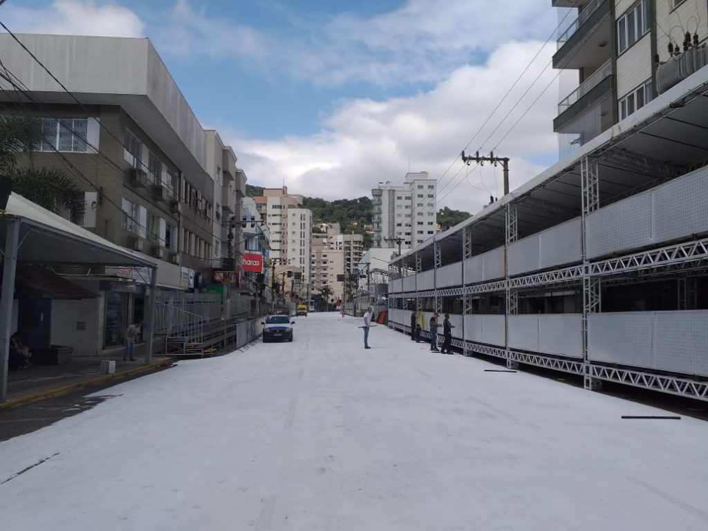 A Avenida XV de Novembro em Joaçaba está praticamente pronta para o desfile das Escolas de Samba que acontecem neste sábado, dia 22, e segunda-feira, 24. O trajeto por onde vão passar as três escolas já recebeu uma pintura especial e as equipes de trabalho estão fazendo os retoques finais na estrutura. O número de arquibancadas foi reduzido em relação ao ano passado para possibilitar que público encontre mais espaços para assistir aos desfiles. Confira algumas fotos que mostram como está a XV de Novembro.