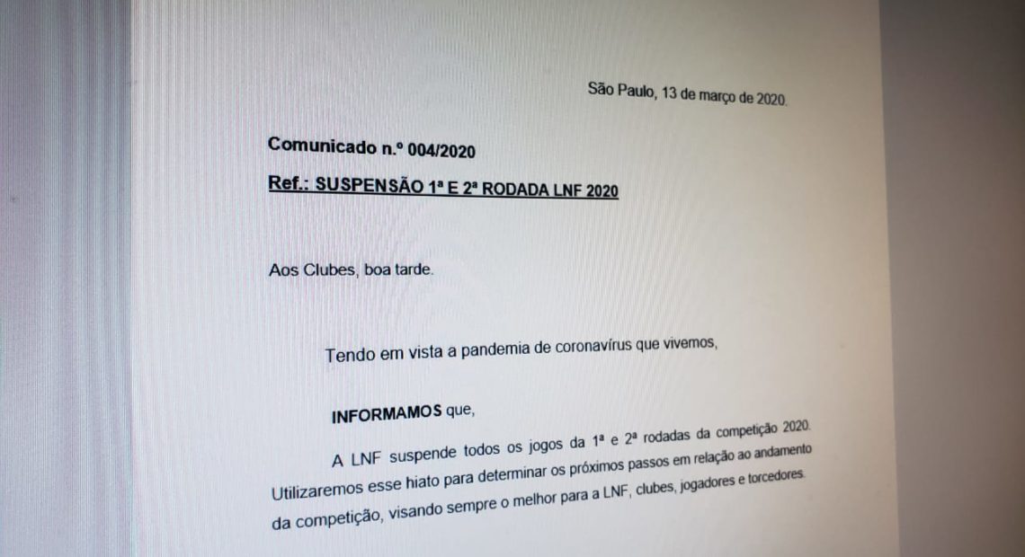 O presidente da Liga Nacional de Futsal, Cladir João Dariva, emitiu um comunicado no início da tarde desta sexta-feira (13) adiando todos os jogos da 1ª e 2ª rodadas da LNF. Os jogos estavam programados para o último final de semana deste mês de março e o primeiro final de semana de abril. A decisão foi tomada, seguindo recomendação do Ministério da Saúde, em forma de prevenção para que sejam evitados eventos com aglomeração de pessoas. O Joaçaba jogaria no dia 29 em casa contra o Umuarama e no final de semana seguinte, na 2ª rodada, em São Paulo contra o Corinthians.