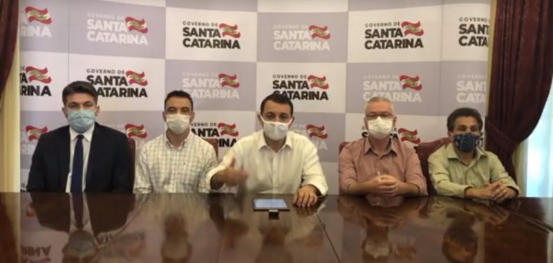 O procurador-geral de Santa Catarina, Alisson de Bom Souza, o delegado-geral de Polícia, Paulo Koerich, o controlador geral do Estado, Luiz Felipe, e o secretário da Saúde estiveram ao lado de Moisés no pronunciamento.