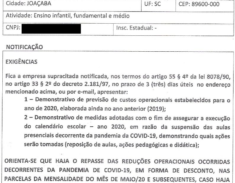 O Ministério Público e o POCON de Joaçaba notificaram as instituições de ensino privadas de Joaçaba. Os órgãos de defesa do consumidor solicitaram documentos como planilha com previsão de custos para 2020 e as medidas que foram adotadas a fim de assegurar a execução a execução do calendário escolar e principalmente se vai ser repassado algum desconto referente aos dias em que a instituição estava sem aulas presenciais.