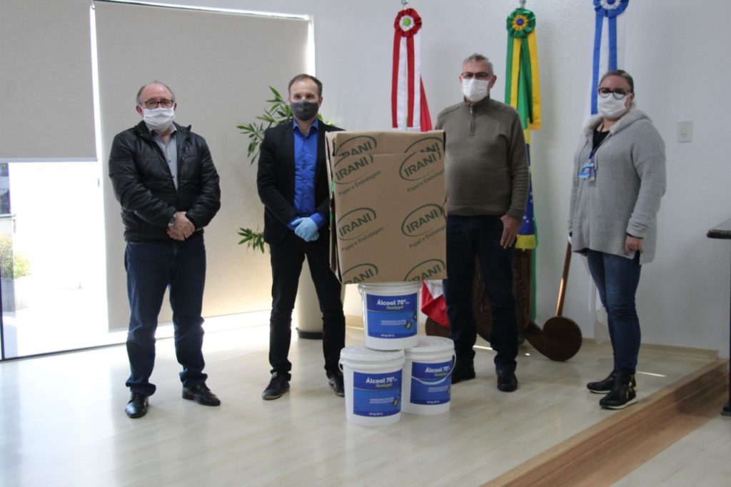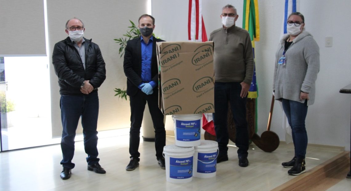 Na tarde desta segunda-feira (25), a prefeitura de Joaçaba recebeu da empresa Irani Papel e Embalagem S.A., representada pelo Gerente de Saúde, Segurança, Qualidade e Sustentabilidade, Leandro Alexis Farina, a doação de 2 mil unidades de luvas descartáveis, 200 unidades de máscaras N95, 500 unidades de máscaras descartáveis e 150 kg de álcool em gel 70%.