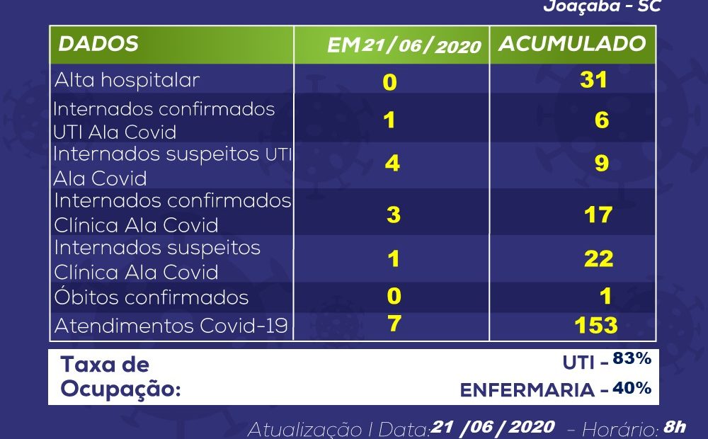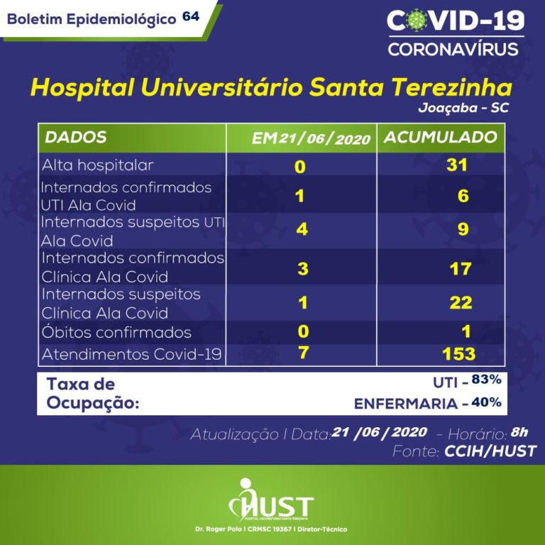 A taxa de ocupação de leitos na Unidade de Tratamento Intensivo da ALA-COVID-19 do Hospital Universitário Santa Teresinha de Joaçaba chegou a 83% neste domingo (21). É a primeira vez deste o início da pandemia que a taxa de ocupação chega a esse índice. São 5 pacientes internados na UTI. Já na ala de enfermaria, também na ALA Covid, onde não há necessidade de respiradores, a ocupação está em 40%. São 4 pessoas internadas de acordo com o boletim divulgado neste domingo pelo HUST.