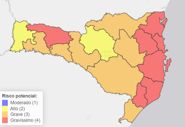 Segundo o quadro, sete regiões apresentam risco potencial grave e duas – assinaladas em amarelo – são classificadas como alta. Santa Catarina não tem nenhuma cidade com risco moderado.