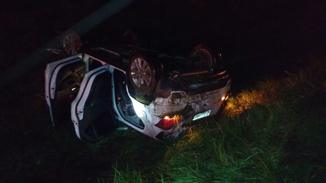 Um veículo Tracker com placas de Chapecó, saiu da pista e capotou. O condutor de 50 anos, uma mulher de 45 anos e uma jovem de 15 anos, não se feriram e encontravam-se fora do veículo quando a guarnição chegou ao local.