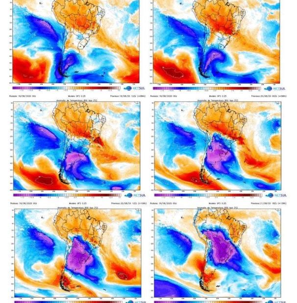 A previsão indica que as temperaturas irão baixar muito durante a quarta-feira, dia 19, no Rio Grande do Sul, chegando a Santa Catarina no dia seguinte, quinta-feira, dia 20.