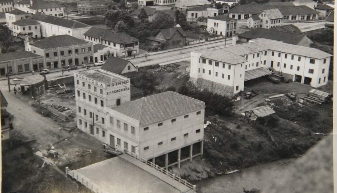 Foto histórica de Joaçaba Compartilhe Uma foto que é uma verdadeira relíquia. Ela mostra a famosa esquina da empresa Bonato e a ponte do rio do Tigre em construção.