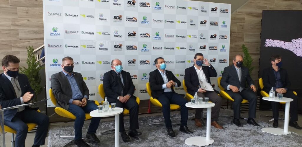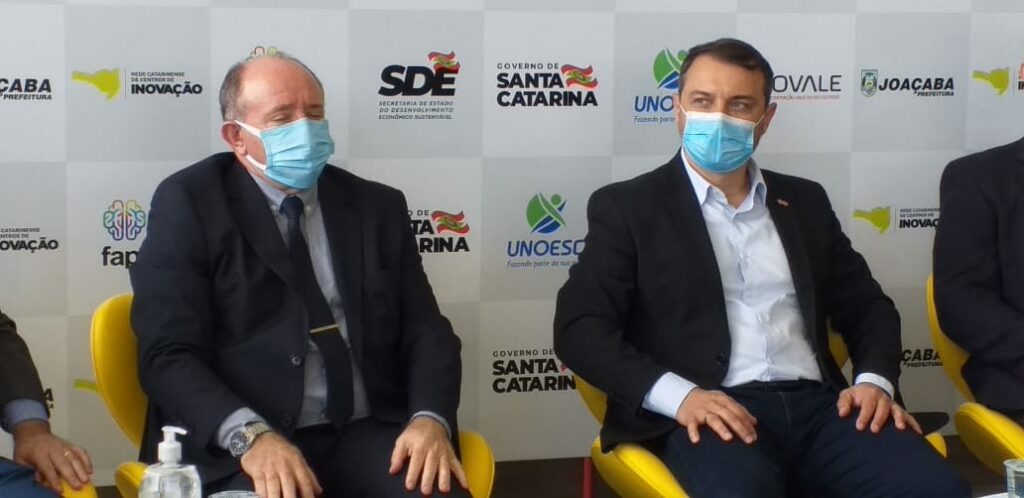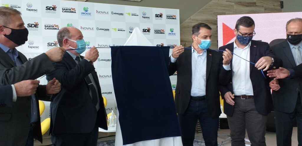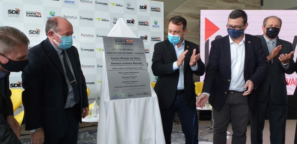 Foi inaugurado na manhã desta terça-feira (08) em Joaçaba o Polo de Inovação Vale do Rio do Peixe – INOVALE. A estrutura foi entregue pelo Governo do Estado. O evento contou com a participação do Governador Carlos Moisés, o secretário da SDE, Celso Albuquerque, o presidente da Fapesc, vinculada da SDE, Fábio Holthausen; o Prefeito de Joaçaba, Dioclésio Ragnini; o reitor da Unoesc, Aristides Cimadon e o diretor de Ciência, Tecnologia e Inovações da SDE, Rafael Meyer.