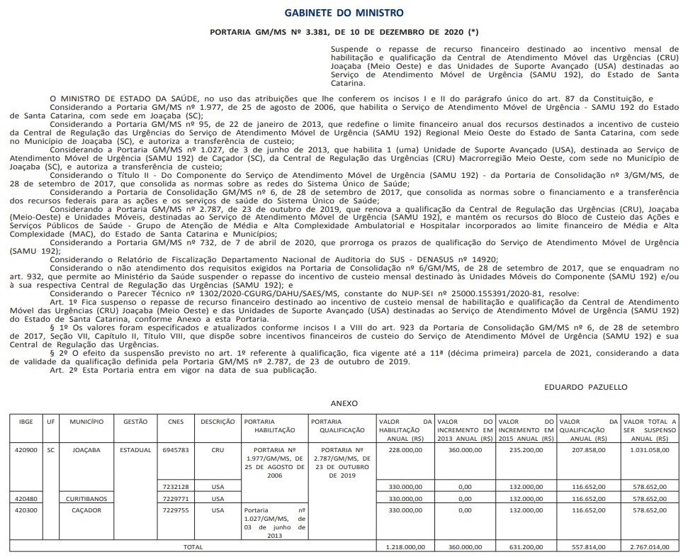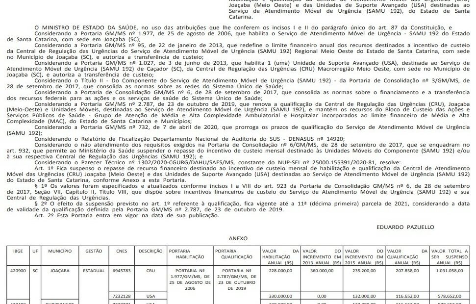 Portaria do Ministério da Saúde suspende repasse de recursos para o SAMU Regional com sede em Joaçaba Compartilhe Documento (em anexo), foi publicado na sexta-feira (11) no Diário Oficial da União. Corte da verba deverá chegar na quantia de R$ 3 milhões. Portaria do Ministério da Saúde