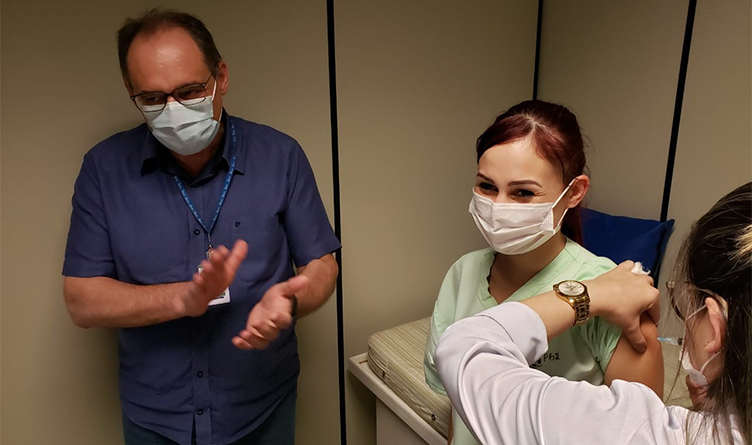 O coordenador da Ala Covid, doutor João Rogério Nunes Filho, e a enfermeira, Herica Aparecida Bressan, foram os primeiros colaboradores do HUST a serem vacinados.