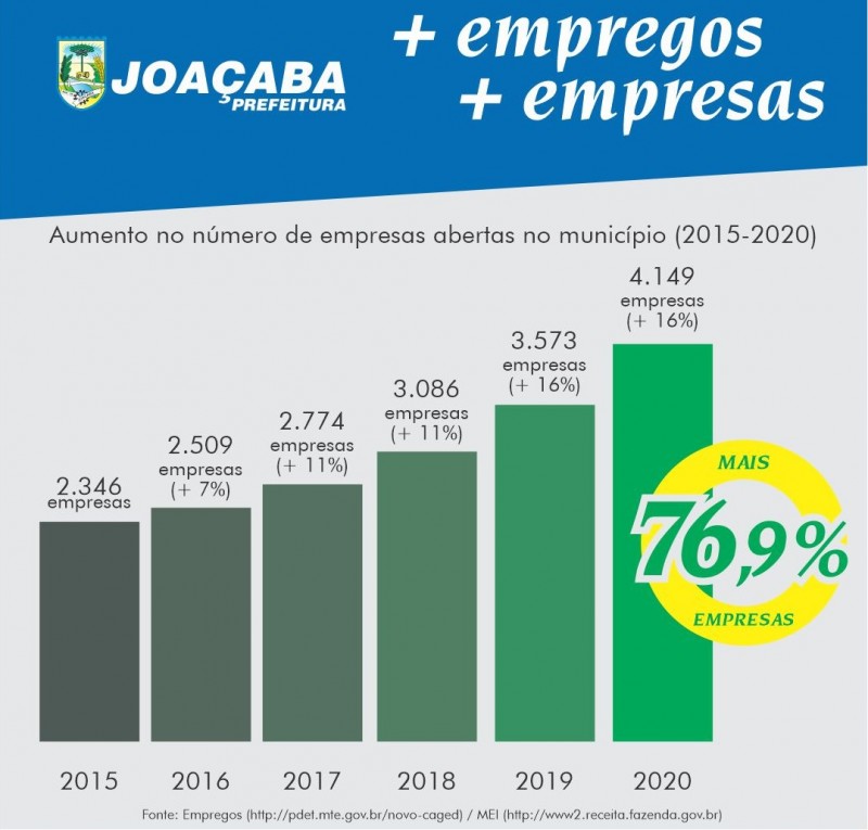 O aumento desses números se deu em função da desburocratização de leis que impossibilitavam o crescimento. “Para que nosso município se desenvolvesse de maneira tão significativa como os números apresentam, fizemos alterações na Legislação Municipal, como a Lei 400, que dispensou o Alvará de Localização e Funcionamento e também a Lei 398, que é do Código de Obras, que veio facilitar a implantação de novas obras e consequentemente de novos empreendimentos. Além disso, criou-se a Central de Processos, unificando as atividades para abertura de novas empresas em um único local juntamente com as fiscalizações, vindo a facilitar e alinhar a metodologia de trabalho da Prefeitura com a metodologia da Junta Comercial, Corpo de Bombeiros e Vigilância Sanitária, fazendo com que o tempo de abertura de uma empresa diminuísse de 7 dias para 2 dias”, explicou o prefeito Dioclésio Ragnini.
