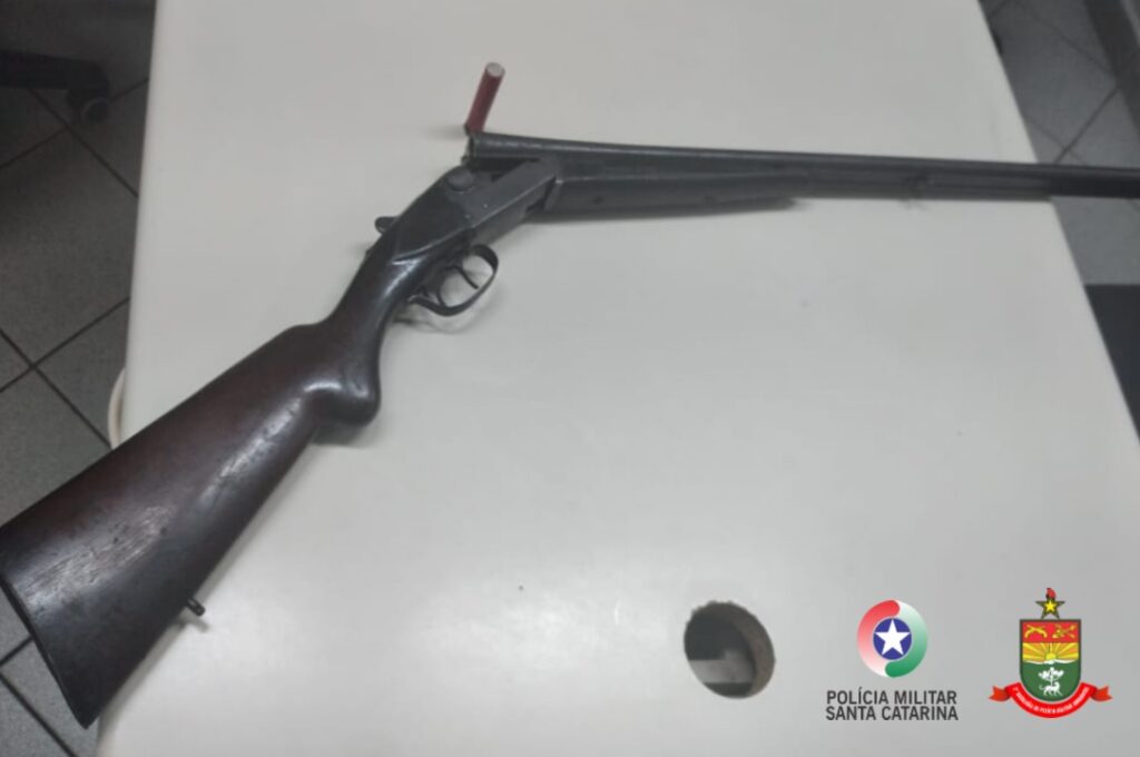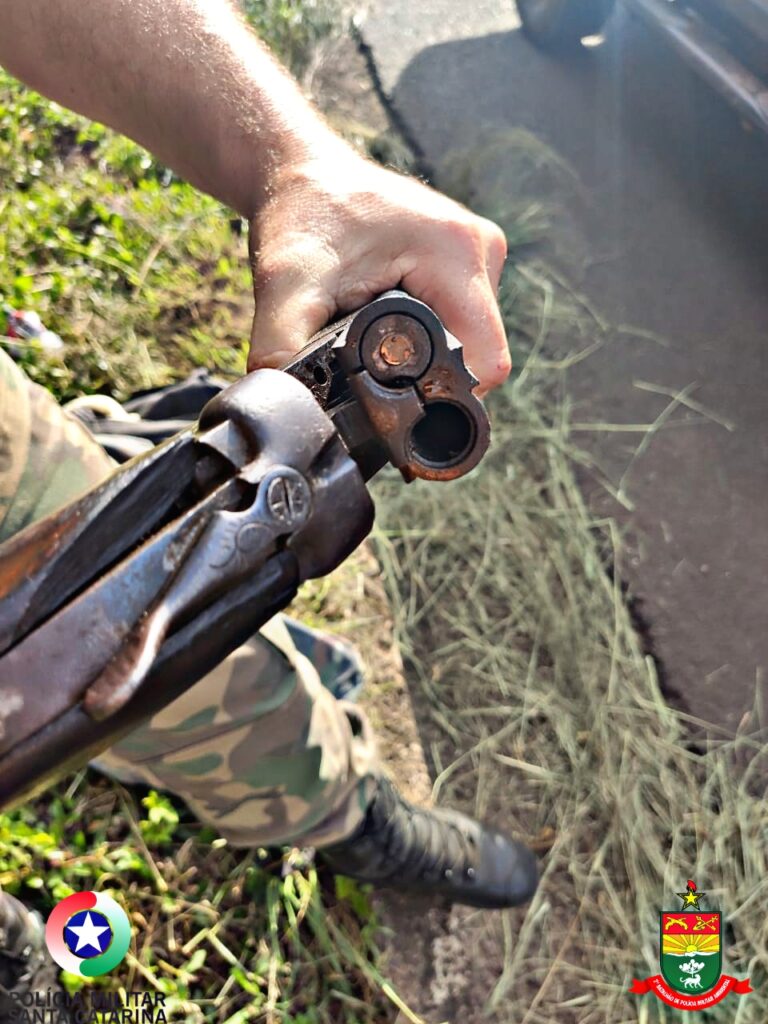 A Polícia Militar Ambiental (PMA), através da Unidade de Joaçaba, deu atendimento de ocorrência de porte ilegal de arma de fogo onde durante deslocamento pela rodovia BR 153, KM 14, próximo ao Posto Horizonte 2, a guarnição avistou dois homens transitando a pé pelo acostamento. Um deles possuía nas costas uma mochila com um volume envolto por uma blusa, aparentando ser uma arma de fogo.