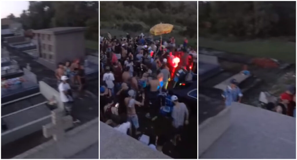 As imagens foram compartilhadas nas redes sociais e mostram jovens sem máscara dançando e ingerindo bebida alcoólica ao lado de túmulos. Conforme os moradores, o evento teria começado por volta da 1 hora em uma casa próxima ao cemitério.