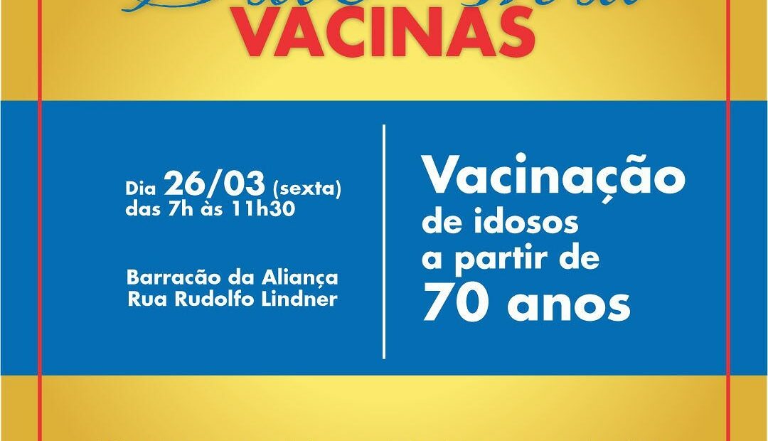 A Secretaria de Saúde de Joaçaba informa, que nesta sexta-feira (26) realizará Drive – Thru de Vacinação, das 7h às 11h30, no Barracão da Escola de Samba Aliança para idosos a partir de 70 anos. É necessária a apresentação de documento de identidade e comprovante de residência. Também solicita-se a carteira de vacinação, caso o idoso possua.
