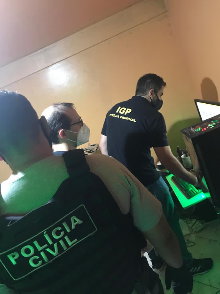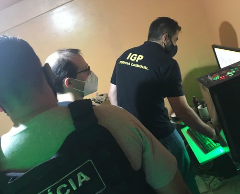 A perícia realizada no local pelo IGP constatou que o suspeito armazenava em um computador, e disponibilizava por meio de programa específico, material contendo pornografia infantil.O suspeito foi autuado em flagrante pela prática de crimes previstos no Estatuto da Criança e Adolescente (ECA).