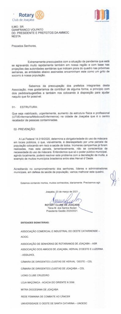 Com um documento em tom de “grito de socorro pela população”, o Rotary Club de Joaçaba encaminhou na manhã desta quarta-feira (03) um importante ofício à Associação dos Municípios do Meio-Oeste Catarinense, com apoio de diversas entidades.