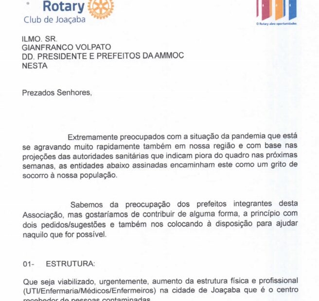 Em mais uma tentativa da sociedade civil de colaborar com as ações já em andamento, o Rotary, com apoio da ACIOC, Associação de Senhoras de Rotariano de Joaçaba, Associação dos Amigos de Joaçaba, Herval d’Oeste e Luzerna, CDL/Herval d’Oeste, CDL/Joaçaba, Lions Clube Cruzeiro, ACACIA do Oriente N3596, Mitra Diocesana de Joaçaba, Rede Feminina de Combate ao Câncer e Unoesc/Joaçaba, encaminharam dois pedidos em forma de sugestão.