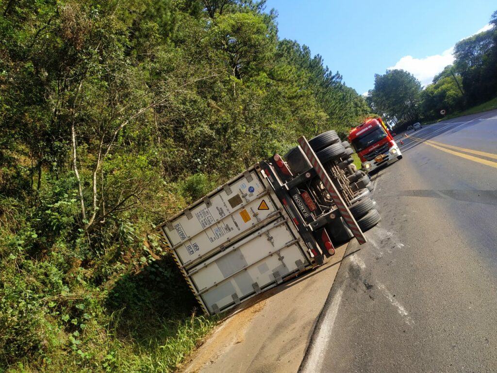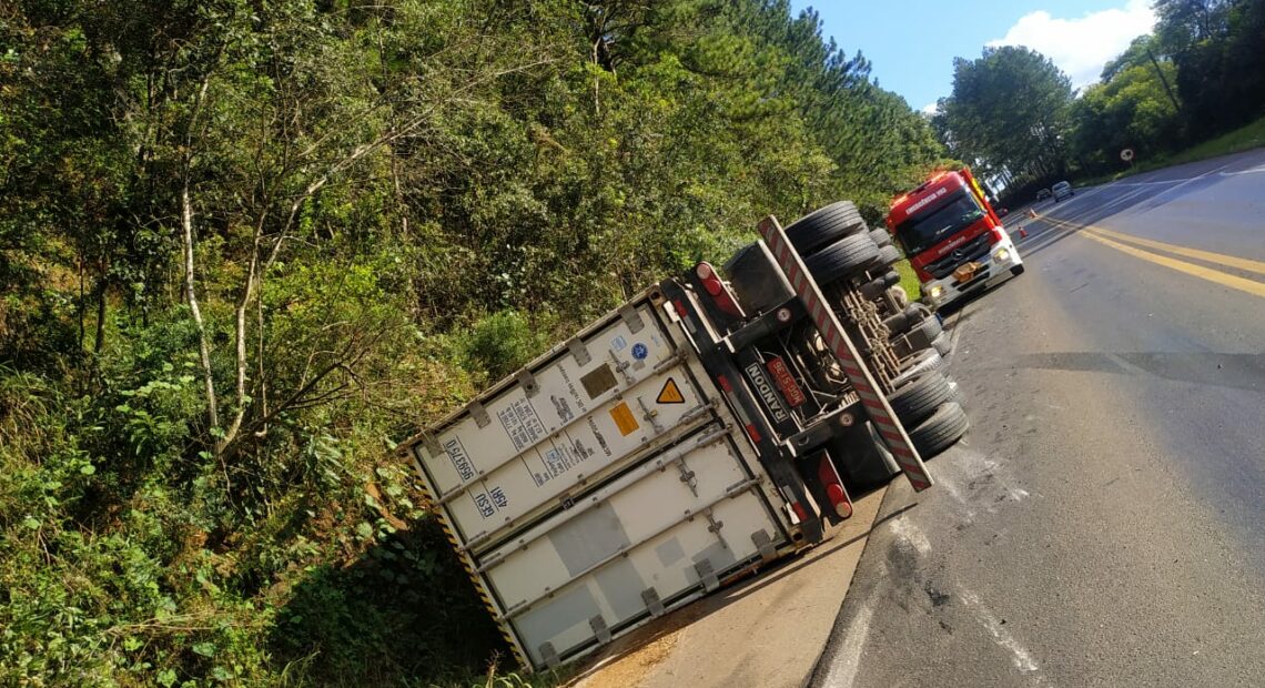 Tombamento de carreta deixa condutor ferido na BR 282 em Vargem Bonita