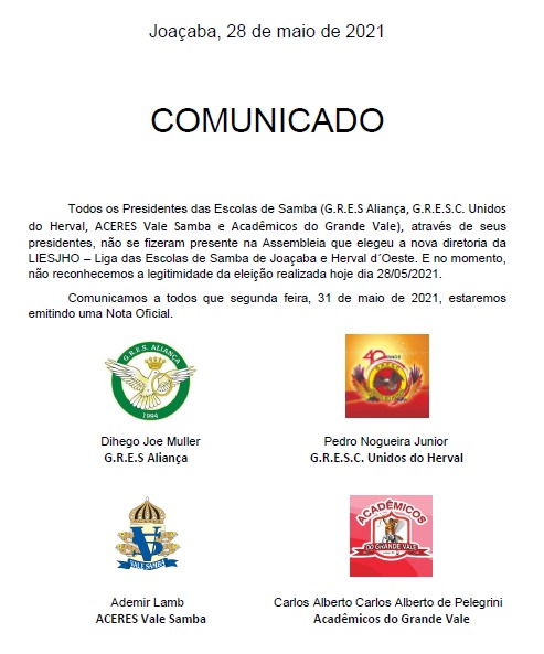 Logo após o resultado, as Escolas de Samba emitiram um comunicado, dizendo que não reconhecem a legitimidade da eleição e informando que na próxima segunda-feira será emitida uma nota oficial a respeito do caso. Eles confirmam que não estiveram presentes na assembleia.