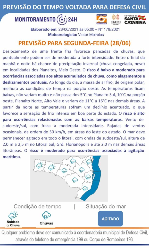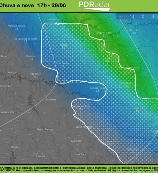 Boletim da Defesa Civil fala em possibilidade de “chuva congelada e neve” para a região de Joaçaba entre o final da manhã desta segunda-feira e noite.