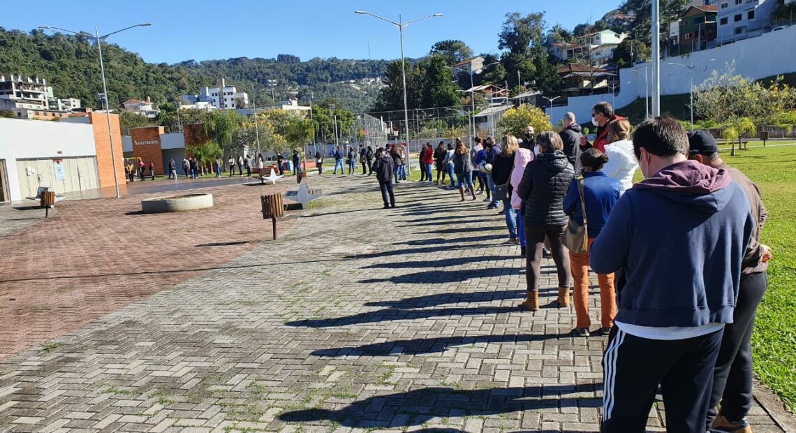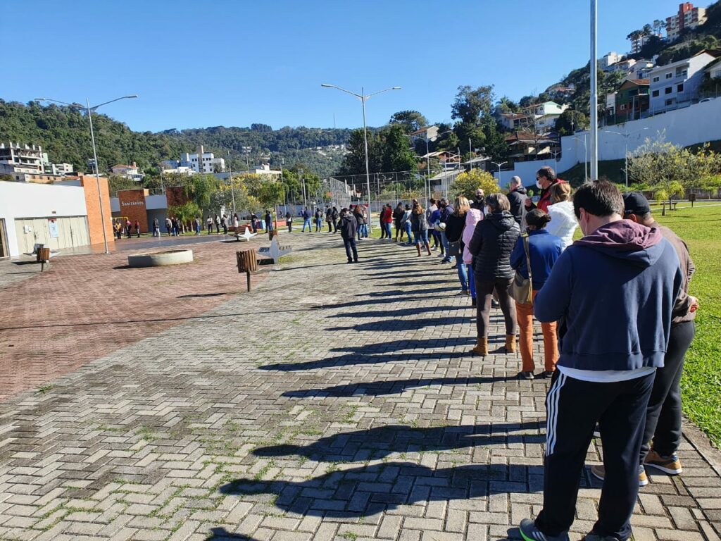 Fila no Parque Municipal Ivan Oreste Bonato em Joaçaba na vacinação da COVID