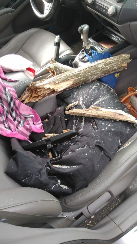 Uma motorista de Água Doce teve muita sorte e escapou de uma tragédia na semana que passou. Na quarta-feira, ela trafegava com seu veículo pela rodovia entre os municípios de Água Doce e Luzerna quando inesperadamente um galho desprendeu de uma árvore, que fica nas margens da rodovia. O galho atingiu o para-brisas em cheio, perfurando o mesmo, indo parar no banco do caroneiro que estava vazio. A motorista, surpreendida com o estrondo, conseguiu manter o controle do veículo. Não sofreu ferimentos e escapou de uma tragédia. Na coluna amassada do veículo, conforme as imagens, é possível ter uma ideia do impacto violento do galho.