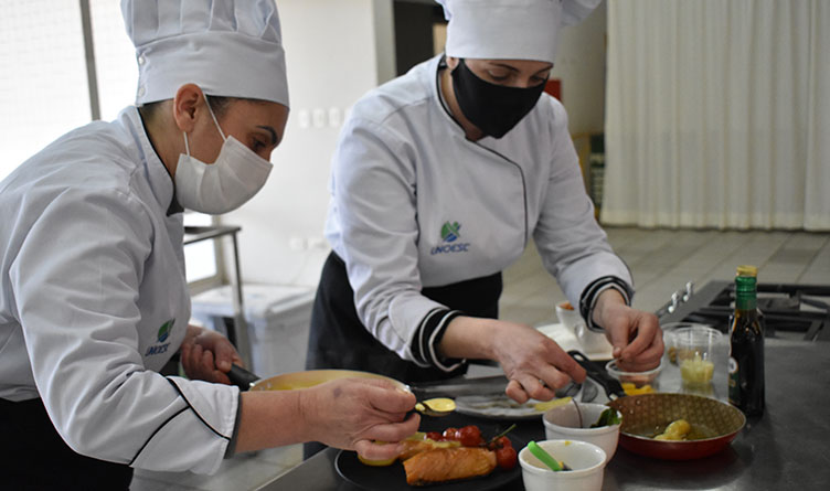 Acadêmicos da terceira fase do curso de Gastronomia da Unoesc testaram os conhecimentos adquiridos ao longo da Graduação e na tarde de segunda-feira (05) apresentaram pratos autorais para avaliação dos professores do curso. A Atividade fez parte do componente curricular “Prática Autoral I”, que de forma integrativa uniu os ensinamentos sobre cozinha brasileira, panificação e confeitaria, resultando em pratos muito elogiados pelo sabor e com apresentações dignas de grandes restaurantes.