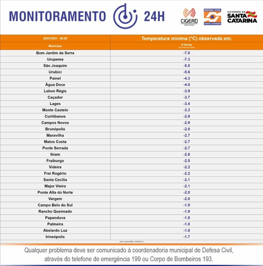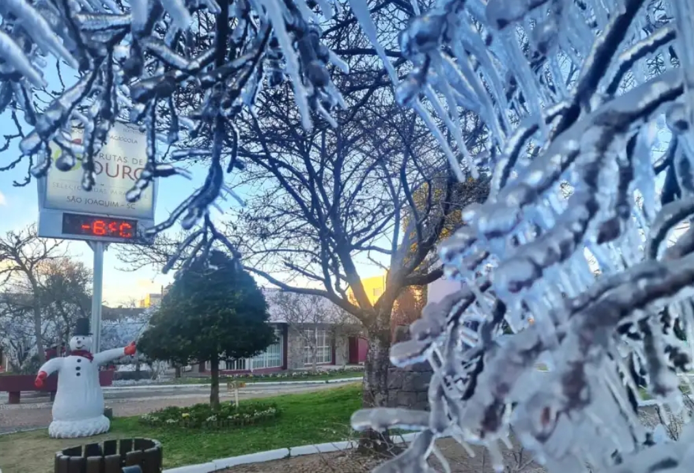 O frio foi intenso durante o amanhecer desta quarta (28) obtendo marcas relativamente congelantes durante as primeiras horas do dia em São Joaquim e região. Principalmente nas áreas de grande altitude da Serra Catarinense. O Morro da Igreja igualou o recorde de julho de 2013 atingindo a marca de -7.8ºC durante o primeiro dia de frio intenso. Estas imagens feitas por Micchel Legnaghi/ Agência de notícias São Joaquim on line, mostram o acúmulo de gelo em árvores na área central da cidade.