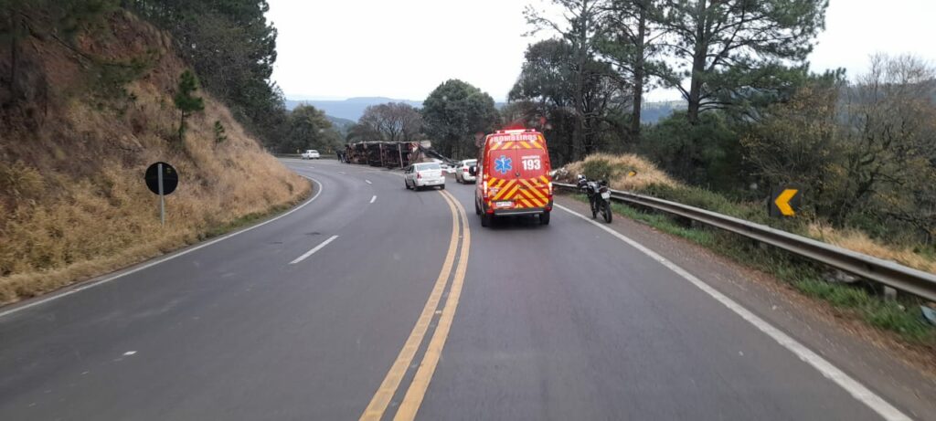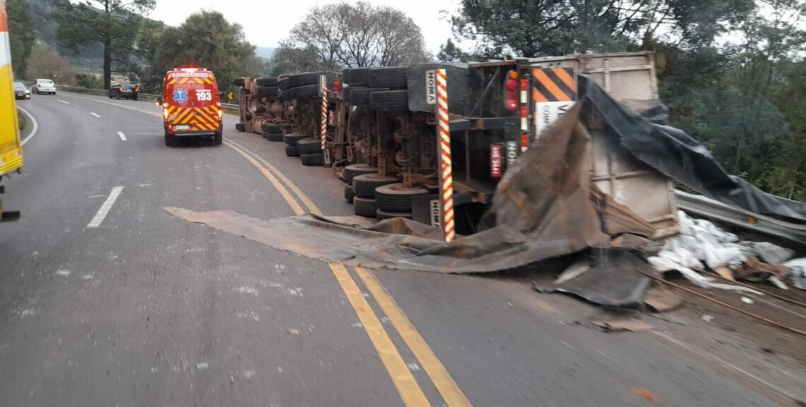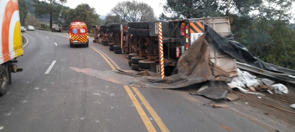 Uma carreta tombou no início da manhã desta quinta-feira (12) na BR-282 no município de Catanduvas. O acidente aconteceu numa curva próximo de uma Ervateira, na saída de Catanduvas. Uma das vias da rodovia, sentido Vargem Bonita, ficou interditada.