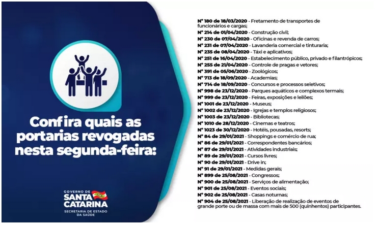 Foram revogadas 28 portarias – publicadas entre 2020 e 2021 – e publicada uma nova portaria com regramentos específicos para estabelecimentos ou entidades que promovam eventos corporativos, feiras de negócios, eventos sociais, shows e entretenimentos em geral. O documento traz as regulamentações referentes ao decreto 1.486, publicado na última semana. Música ao vivo, palestras e apresentações artísticas estão permitidas desde que sigam regramentos gerais como o distanciamento de dois metros entre o palco e o público.
