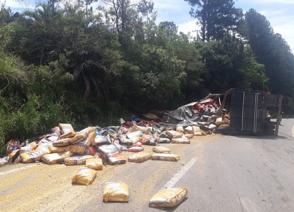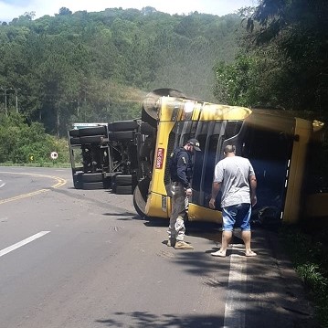 Uma carreta Scania/R450 com placas de Pinheiro Preto, tombou na tarde desta quarta-feira (27) em uma curva da BR 282, nas proximidades da Ervateira Catanduvas.