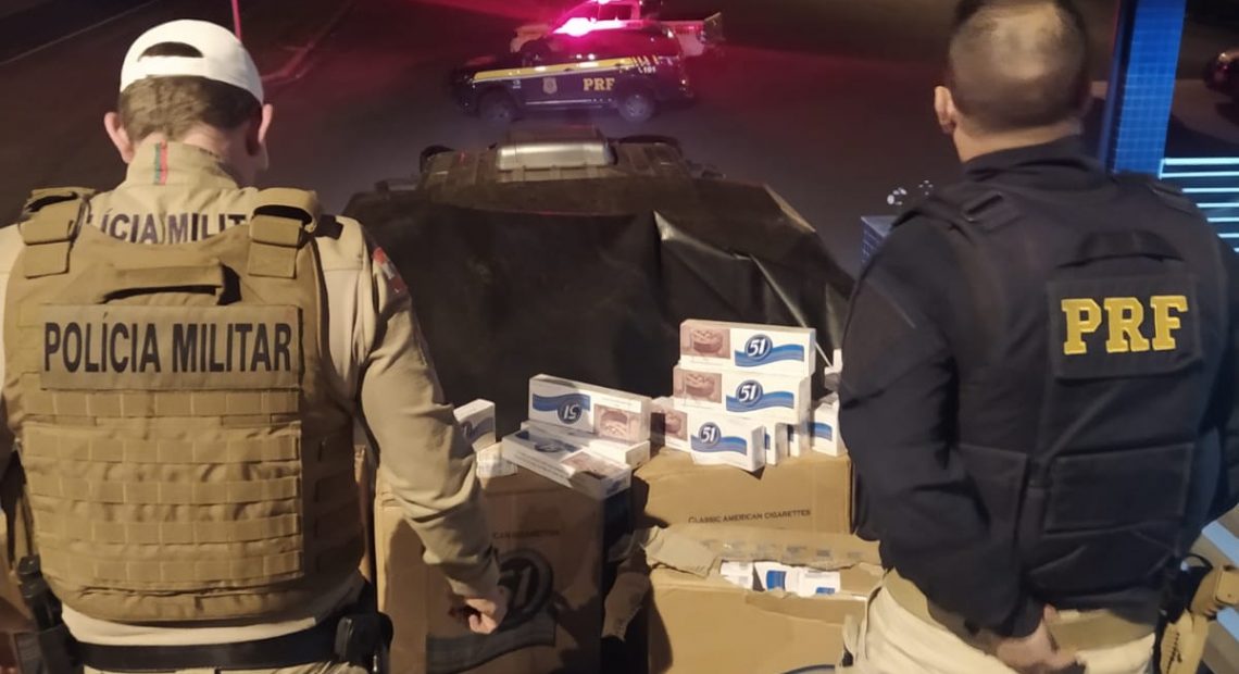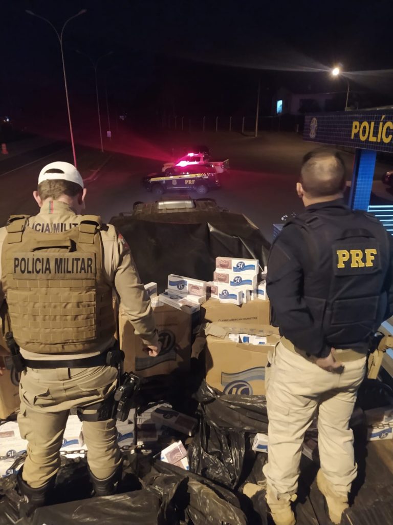 Em ação conjunta de combate ao crime organizado desencadeada na noite desta segunda-feira, dia 18, a Polícia Militar Rodoviária e a Polícia Rodoviária Federal fizeram mais uma grande apreensão de cigarros do Paraguai. O produto de contrabando estava em um caminhão Iveco que foi abordado pelos policiais.