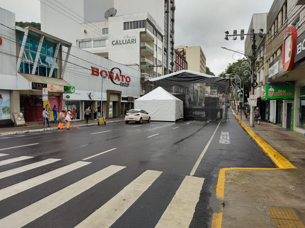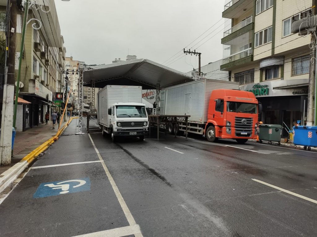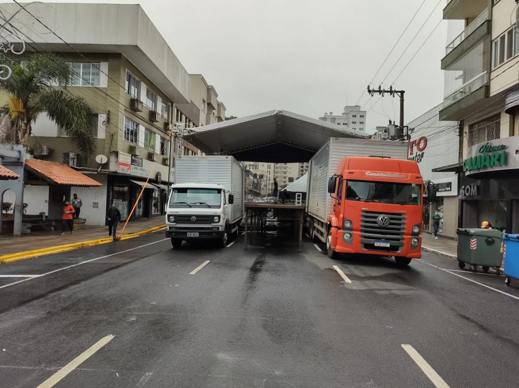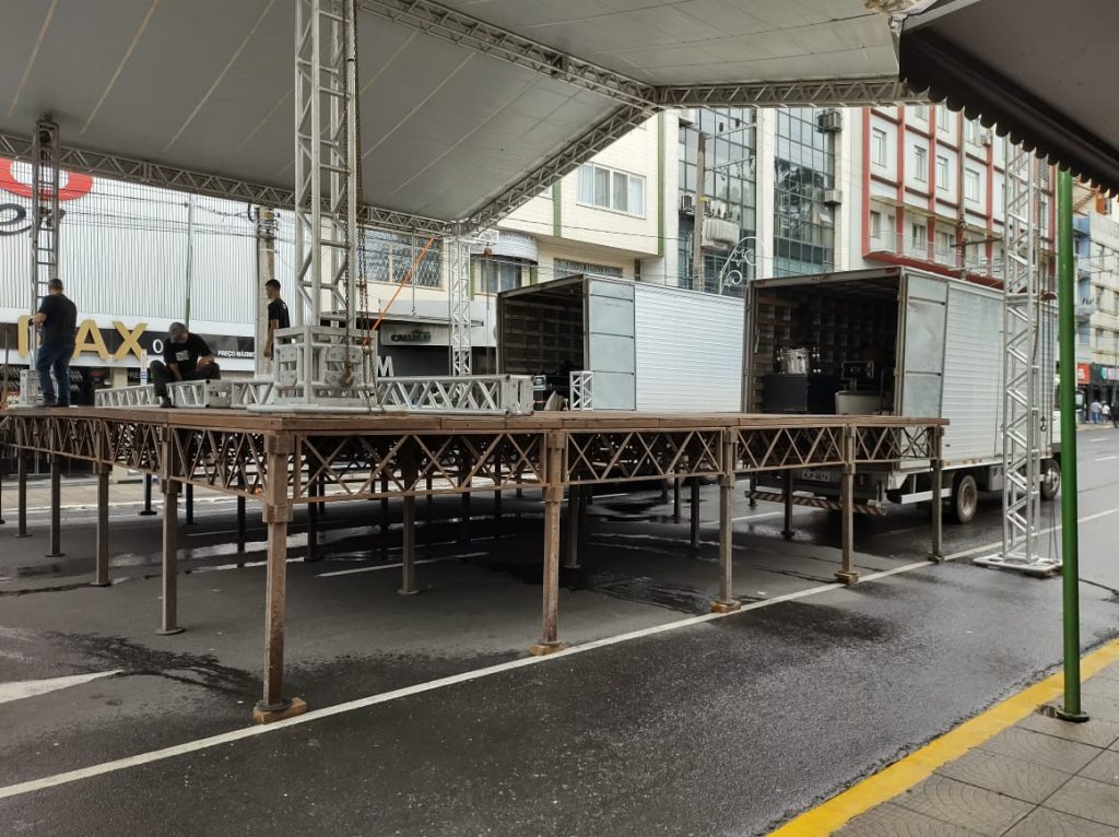 A estrutura para o evento, que envolve palco e fechamento com grades para controle do fluxo de pessoas, está sendo finalizada. A XV, no trecho da loja Bonato ao edifício Pedrini, está fechada para o trânsito e será reaberta na madrugada deste sábado.