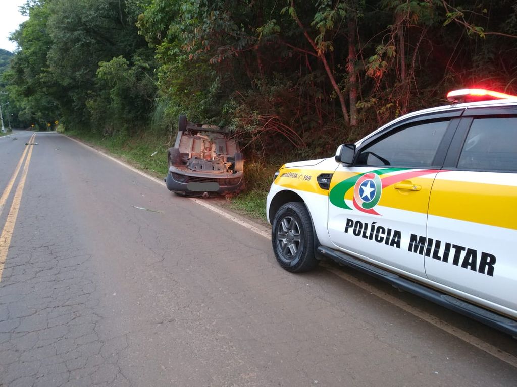 Veículo capota após atingir o barranco na SC 150 em Luzerna