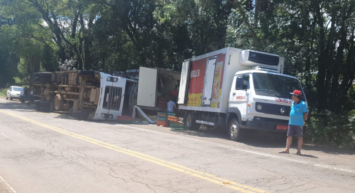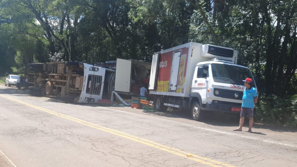 Os populares informaram a que o caminhão de transporte de frango fazia o sentido Piratuba/Capinzal, quando não venceu fazer a curva, tombou e colidiu o caminhão que fazia a direção contrária e jogou para fora da pista.