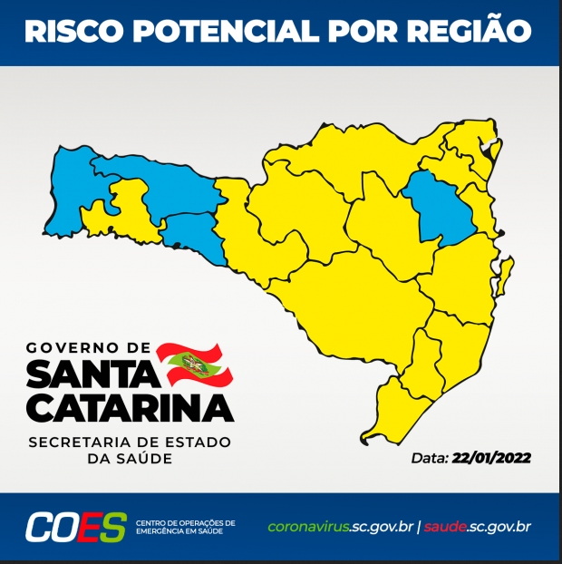 Já o Vale do Itapocú, que estava no nível moderado (azul), teve piora na dimensão transmissibilidade, se juntando às regiões do Alto Vale do Itajaí, Alto Vale do Rio do Peixe, Carbonífera, Extremo Sul Catarinense, Foz do Rio Itajaí, Grande Florianópolis, Laguna, Meio Oeste, Nordeste, Oeste, Planalto Norte e Serra Catarinense que se mantiveram no nível alto (amarelo).