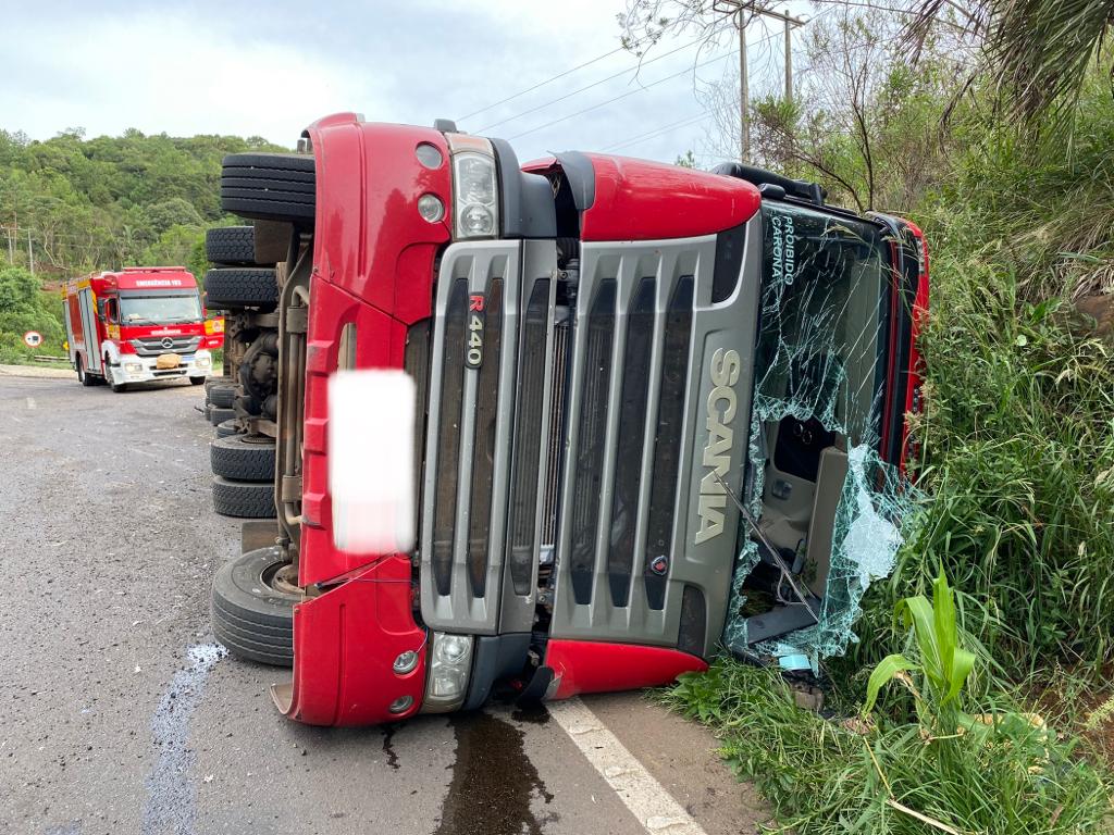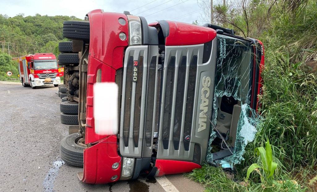 Motorista fica ferido após tombamento de carreta na BR 282 em Catanduvas