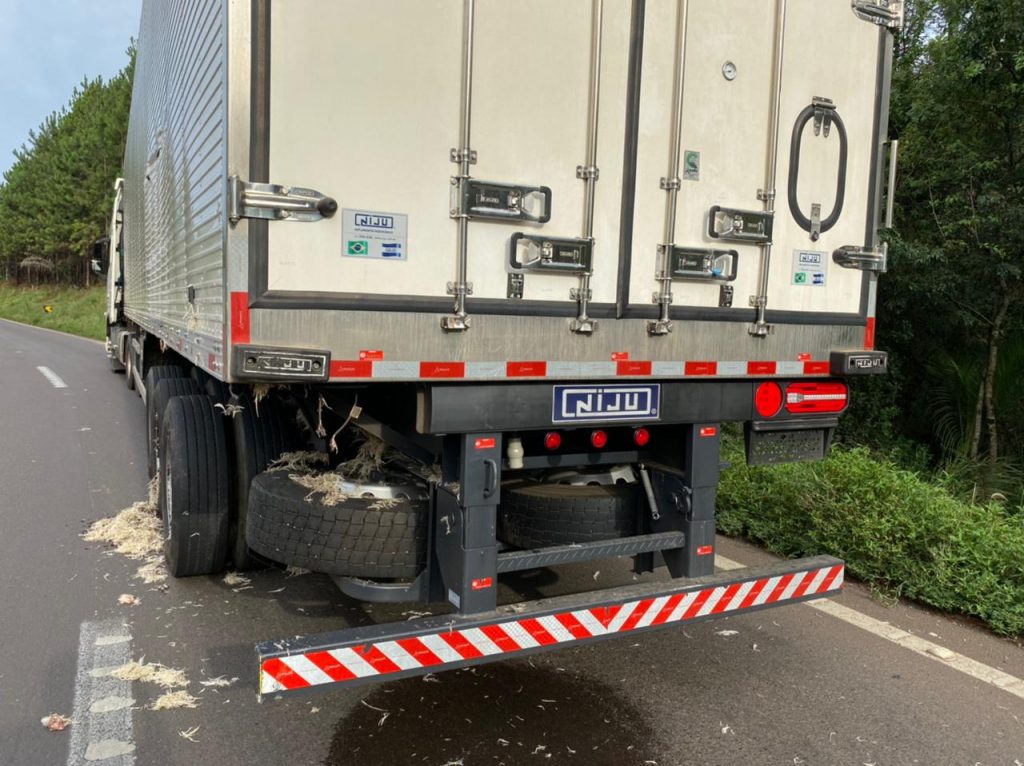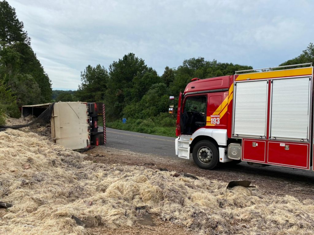 O trânsito é lento no local. A carreta de Ipuaçu que transportava resíduos de frango está tombada ao lado esquerdo da rodovia.