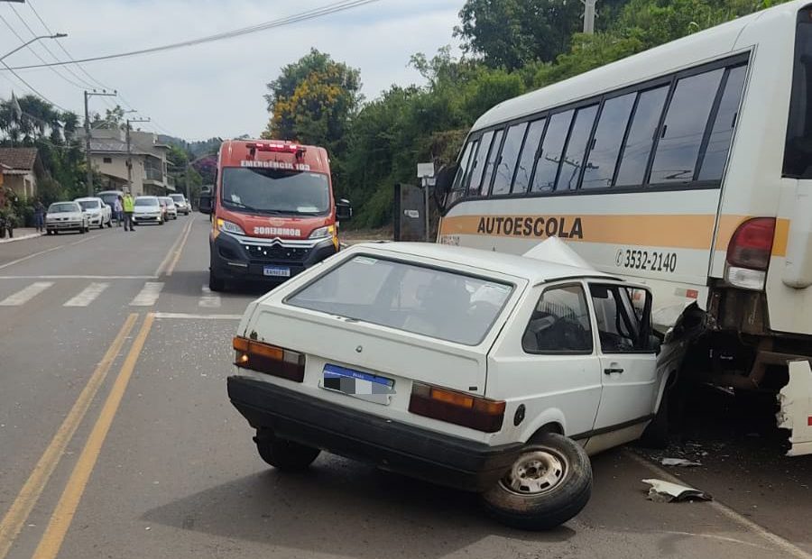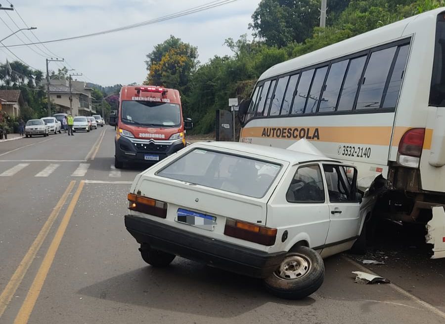 Carro colide contra micro-ônibus estacionado no centro de Tangará