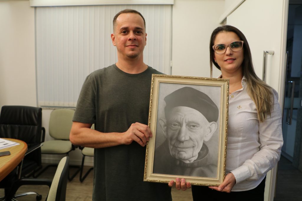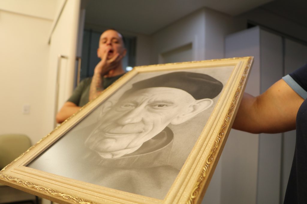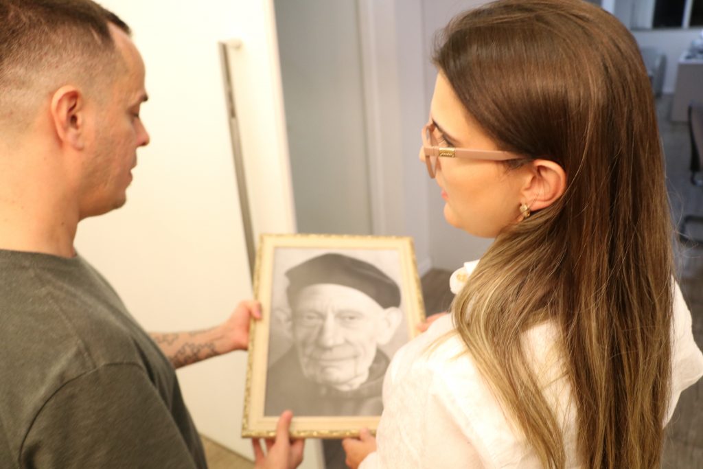 Retrato de Frei Bruno é reproduzido com a técnica de Grafite e doado a CDL/Joaçaba