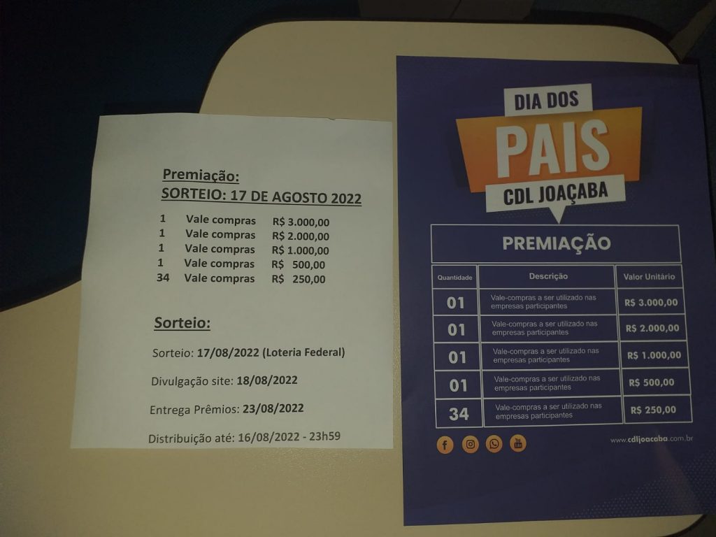 Além de presentear seus pais, quem efetuar as compras no comércio de Joaçaba vai correr o risco de ganhar um dos 38 vale-compras da promoção Dia dos Pais. Na manhã desta segunda-feira (04) a Câmara de Dirigentes Lojistas (CDL) apresentou todos os detalhes desta promoção que vai sortear um total de R$ 15 mil em prêmios. As lojas que participam da promoção, identificadas com cartazes, já estão distribuindo os números da sorte que devem ser cadastrados no site da CDL, num processo rápido e simples. O sorteio será realizado no dia 17 de agosto pela extração da Loteria Federal com entrega da premiação já no dia 23.