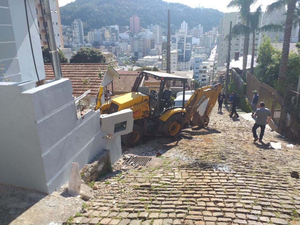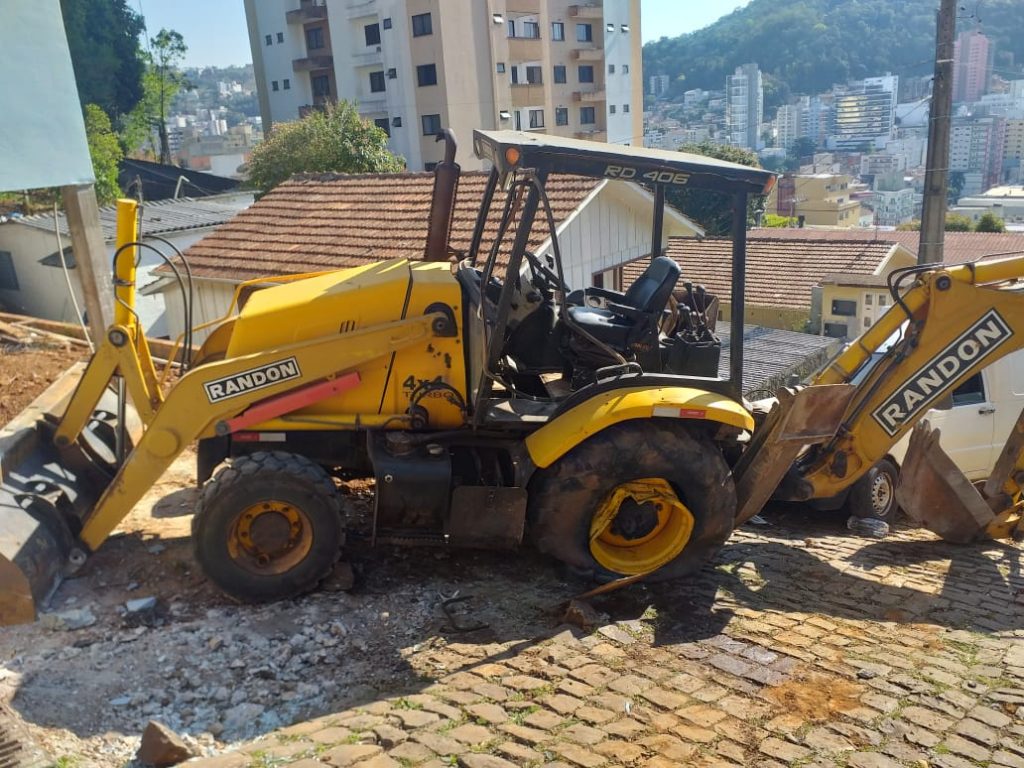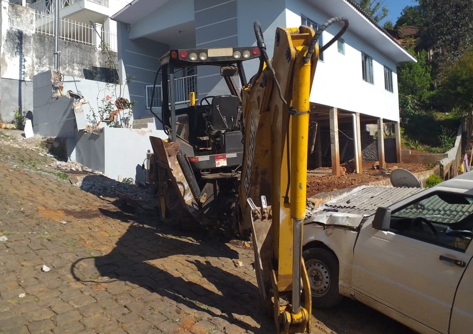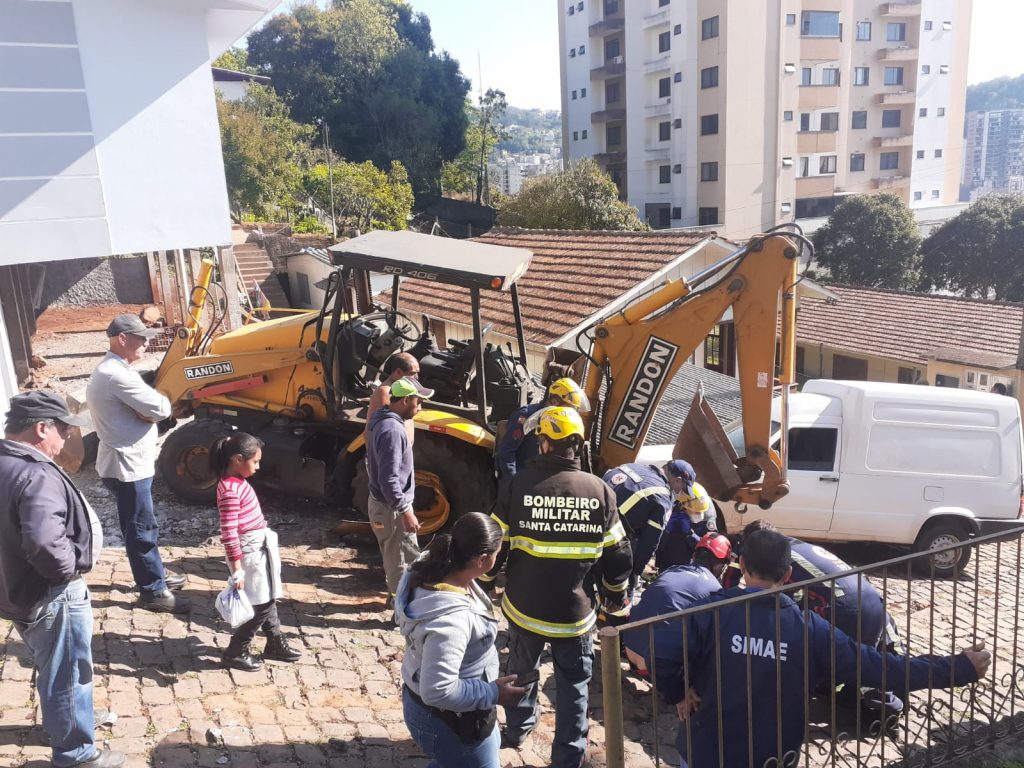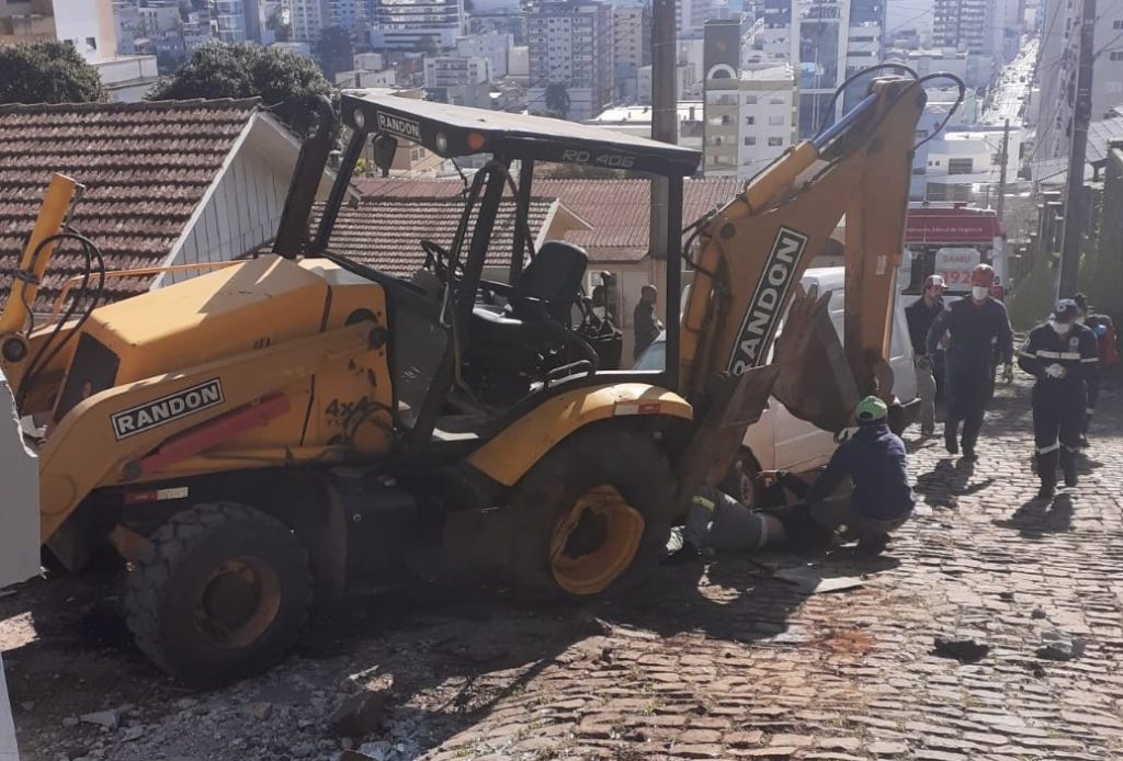 Na manhã desta quarta-feira (24), um trabalhador ficou ferido após a máquina retroescavadeira que ele dirigia desandar e tombar na Travessa Almirante Tamandaré, no bairro Tobias em Joaçaba.