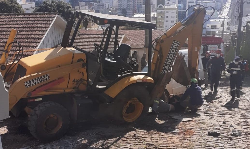 Na manhã desta quarta-feira (24), um trabalhador ficou ferido após a máquina retroescavadeira que ele dirigia desandar e tombar na Travessa Almirante Tamandaré, no bairro Tobias em Joaçaba.