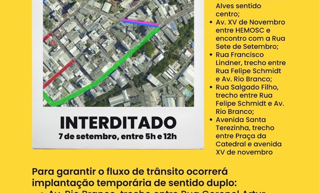 A Diretoria de Trânsito, Transportes e Mobilidade Urbana de Joaçaba comunica que em virtude do Desfile de 7 de setembro (200 anos de independência do Brasil), entre 5h e 12h, ocorrerá interdição das seguintes vias: