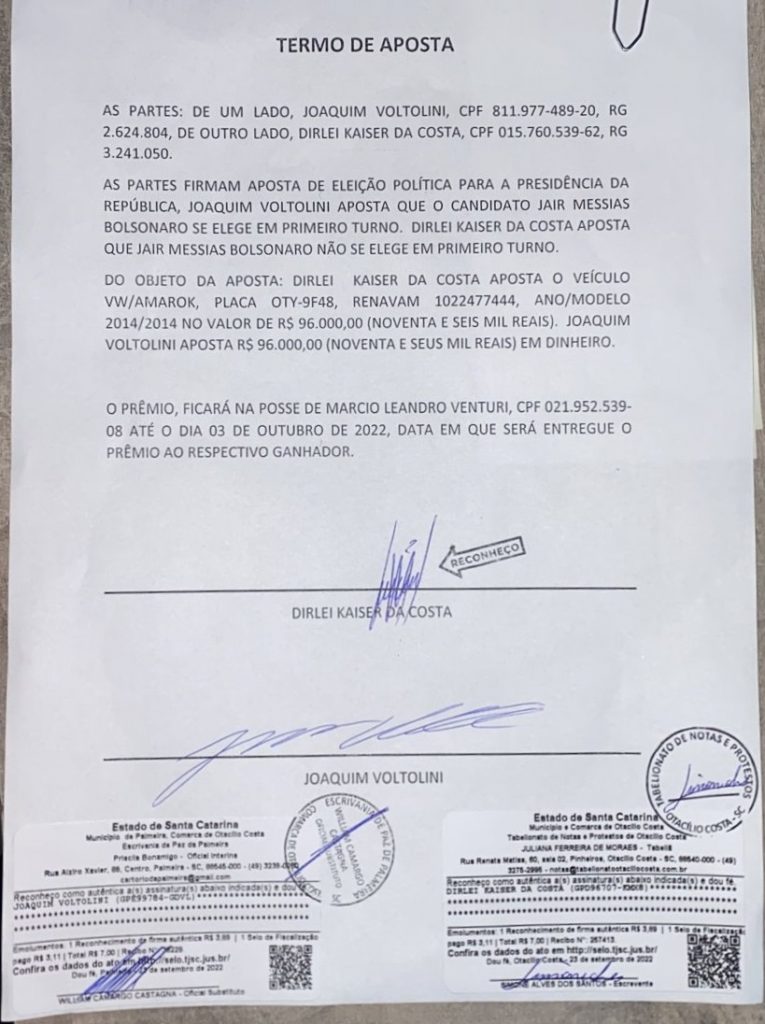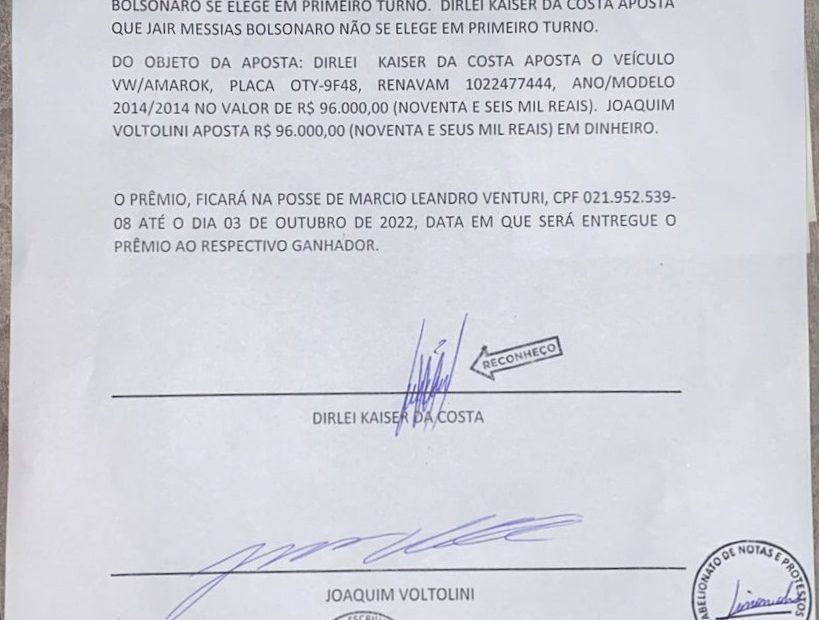 A aposta está inclusive formalizada e registrada em cartório. De acordo com o documento, que circula nas redes sociais, um dos homens aposta R$ 96 mil que o presidente Jair Bolsonaro se elege no primeiro turno. Outro aposta uma caminhonete Volkswagen Amarok, no valor de R$ 96 mil, que Bolsonaro não consegue a reeleição no primeiro turno.