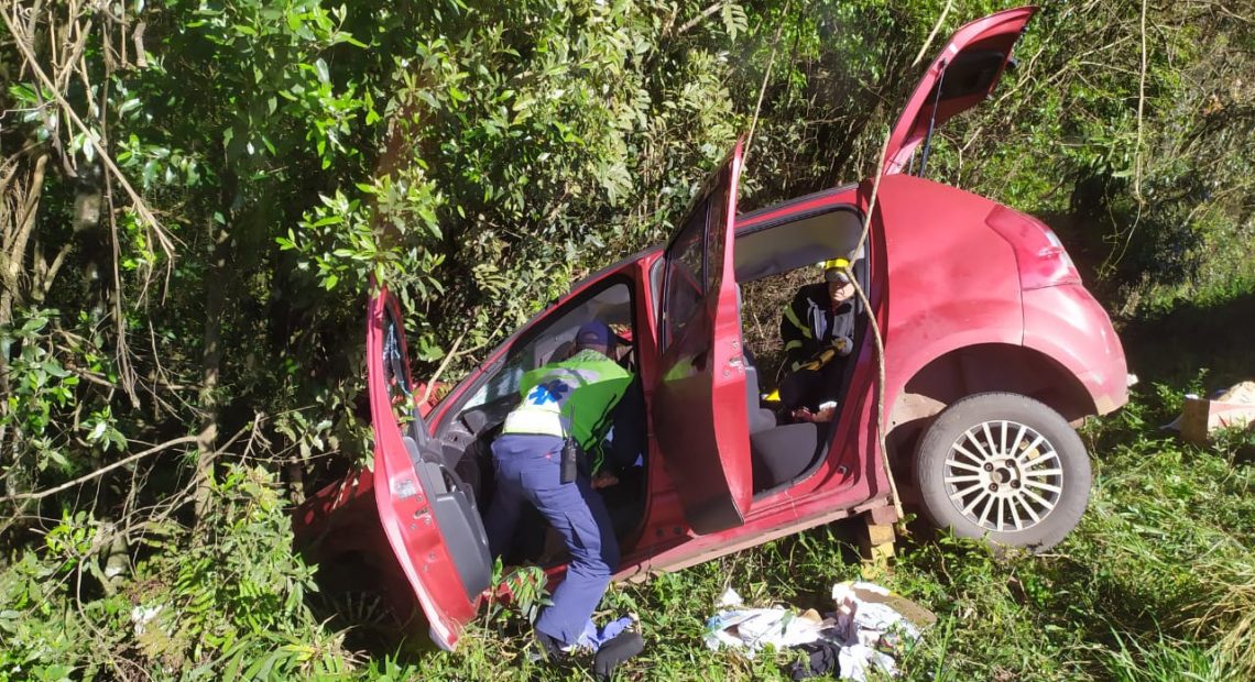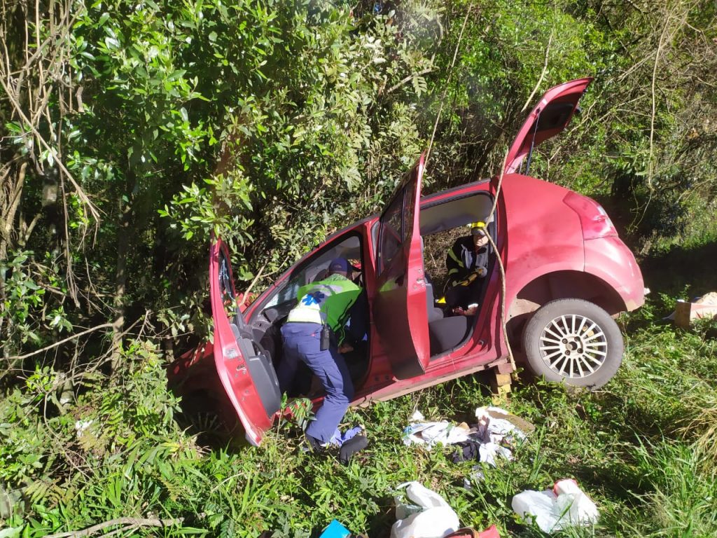 Uma mulher ficou ferida em colisão frontal na BR 282, na cidade de Catanduvas, na manhã desse domingo, dia 18. Conforme o Corpo de Bombeiros Militares desse município, que atenderam a ocorrência, envolveram-se um Renault Sandero, placas de Blumenau e um Astra, de Brasília. Com o choque, o veículo Sandero saiu da pista e colidiu contra árvores. Duas pessoas estavam no interior desse carro, sendo que a passageira foi retirada com suspeita de fatura no braço direito e costelas. Também relatava dores na coluna e nos joelhos. Ela foi levada para avaliação médica no Hospital Universitário Santa Terezinha, em Joaçaba.