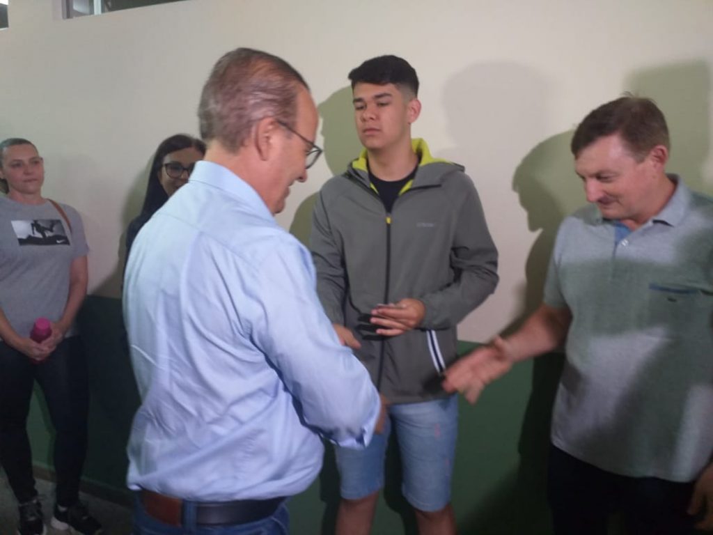 Na ocasião, o governador foi recebido por apoiadores e recebeu um abraço do prefeito de Tubarão, Joares Ponticelli.