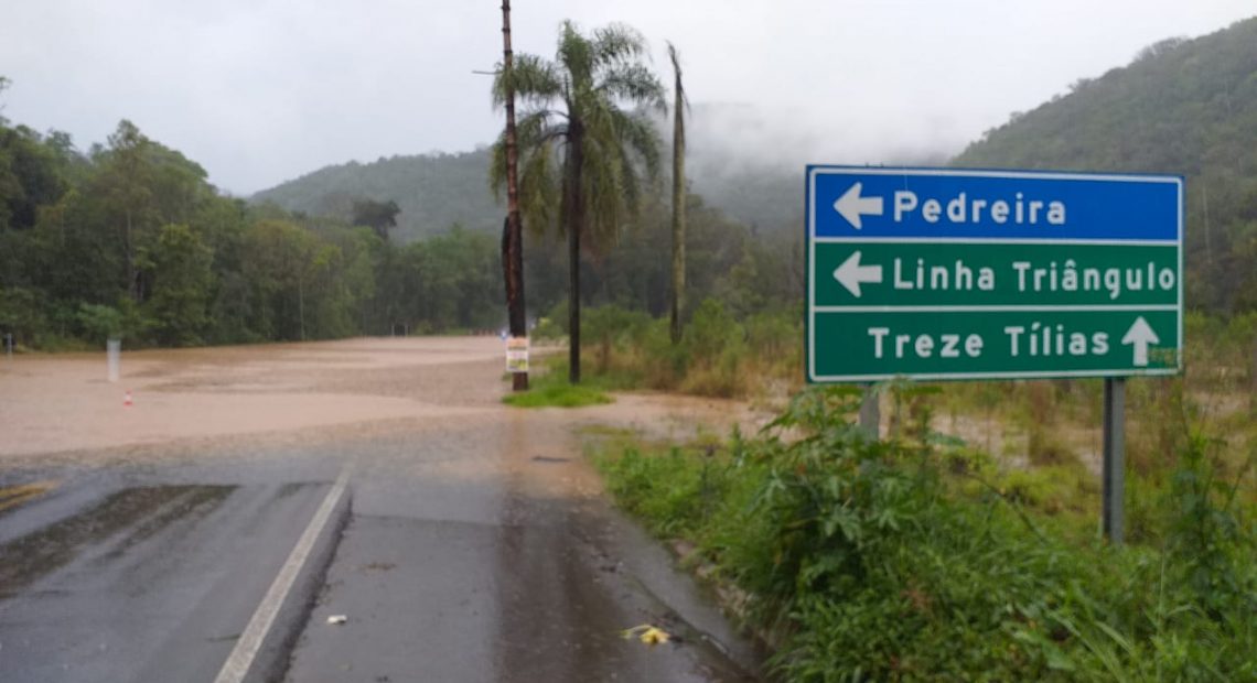 SC-453, km 59,900 – Município de Ibicaré, trecho completamente interditado (entrada para pedreira triângulo) por água na pista.
