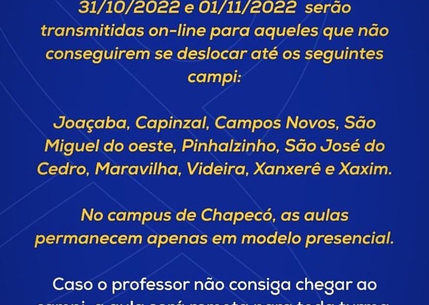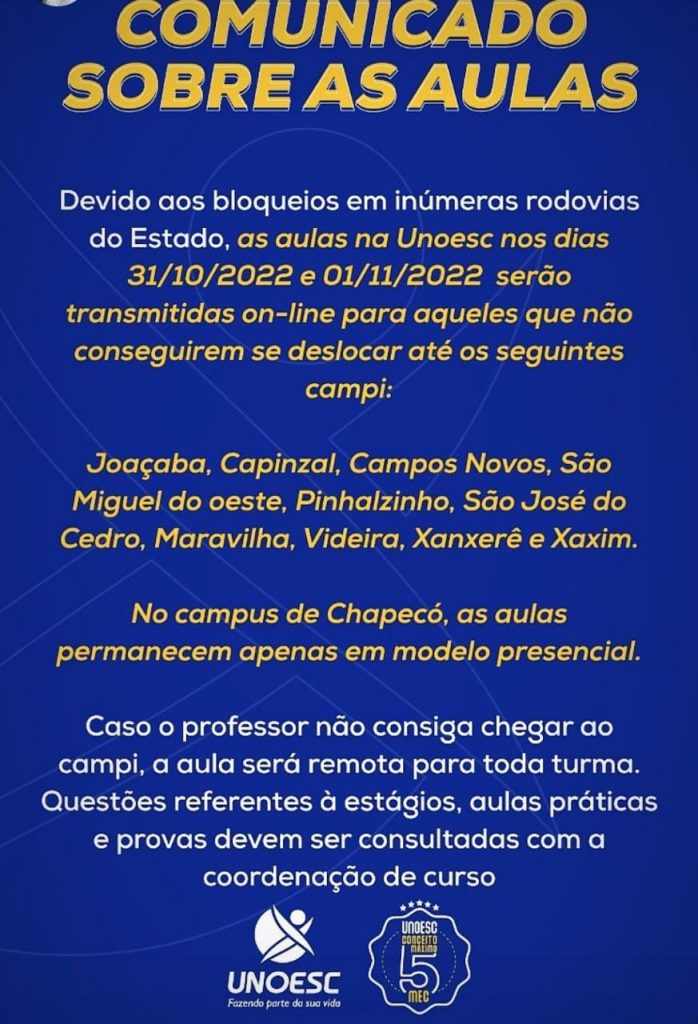 A UNOESC emitiu uma nota no final da tarde desta segunda-feira liberando as aulas online para quem não conseguir se deslocar até a universidade. A medida foi tomada em razão dos bloqueios em várias rodovias da região. Ônibus não estão sendo liberados. As aulas serão retomadas normalmente na quinta-feira, após o feriado.Em Joaçaba o bloqueio permanece na BR-282 em frente ao CPJ.